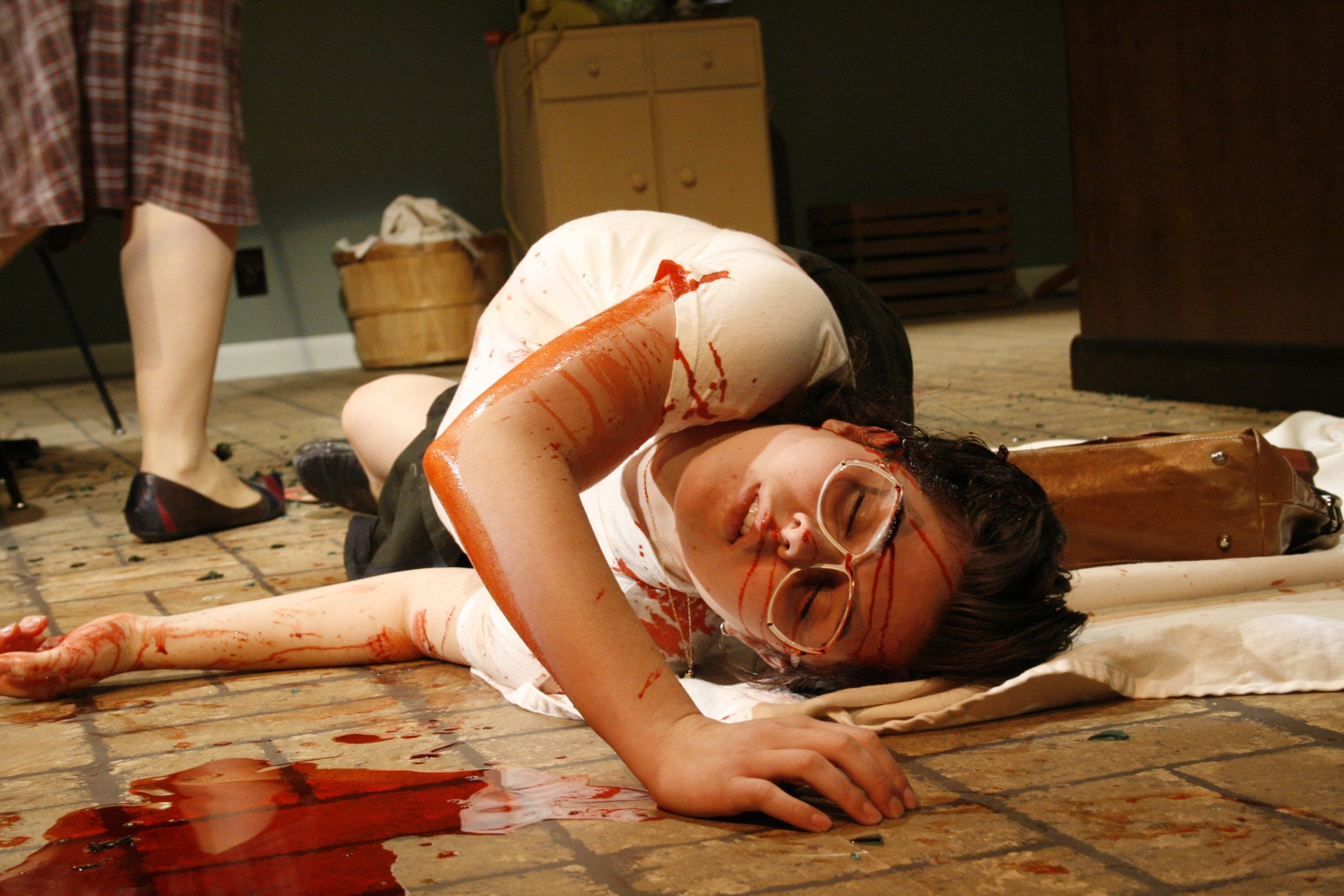 | The Murder of Constance North is a unique challenge offered by this script when it calls for a bottle of red wine to be smashed over her head and then for blood to cover the stage. In order to achieve the desired effect, people from almost every area of the production had to collaborate, experiment, and revise the sequence. I made a special bra for the actress that not only increased and lowered the appearance of the bosom but was also able to conceal a bulb-syringe full of stage blood. Clear tubing inserted into the syringe was then run up underneath a turtleneck and hidden in a hairstyle derived from the 1940s victory rolls. After a breakaway bottle and a blood pack were smashed on her head, Mrs.North fell to the stage with her back to the audience and began to surreptitiously press the syringe hidden at her sternum. Blood then flowed out of her head and created a puddle on the floor that grew right before the eyes of the audience. For a video of the murder please visit: Revealing Secrets |